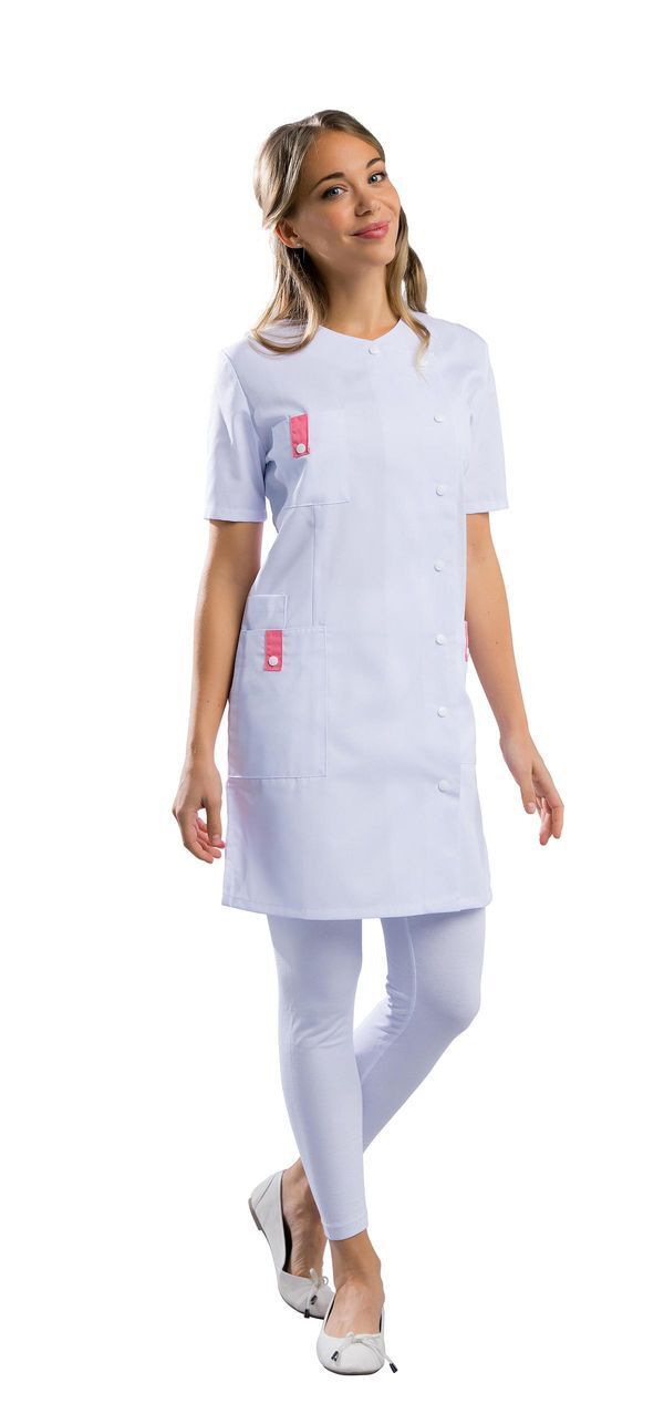 Blouse femme. Fermeture asymétrique par boutons-pressions. 2 poches basses. 1 poche BIP. Poche poitrine. Manches courtes. Fentes côtés. Longueur : 90 cm.