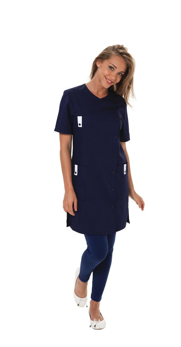 Blouse femme. Fermeture asymétrique par boutons-pressions. 2 poches basses. 1 poche BIP. Poche poitrine. Manches courtes. Fentes côtés. Longueur : 90 cm.