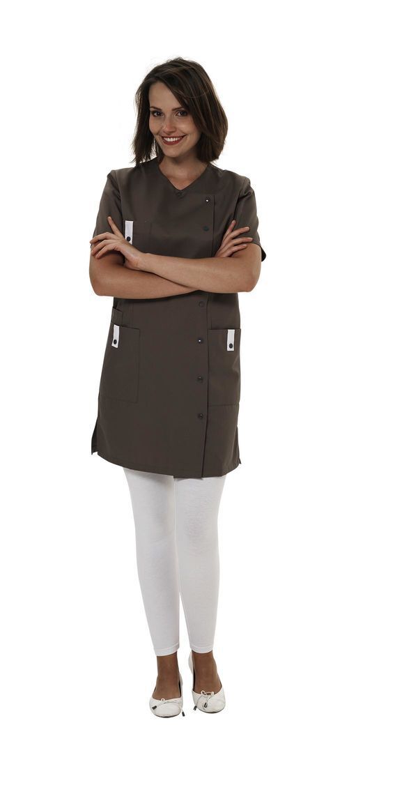 Blouse femme. Fermeture asymétrique par boutons-pressions. 2 poches basses. 1 poche BIP. Poche poitrine. Manches courtes. Fentes côtés. Longueur : 90 cm.