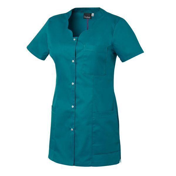 Tunique femme. Encolure fantaisie festonnée. Fermeture milieu devant par pressions inox gravées HASSON®. Pinces devant et dos. Poche poitrine devant gauche. 2 poches basses avec soufflet bas de poche. Manches courtes. Fentes côtés. Longueur : 75 cm