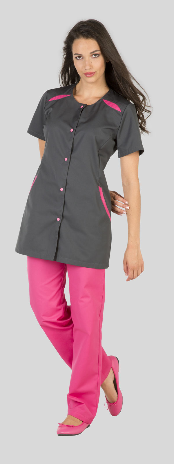 Tunique coupe femme. Encolure ronde ton sur ton. Fermeture centrale par 5 pressions contrastées. Empiècements aux épaules et entrées de poches basse contrastés. Manches courtes. Longueur : 80 cm.