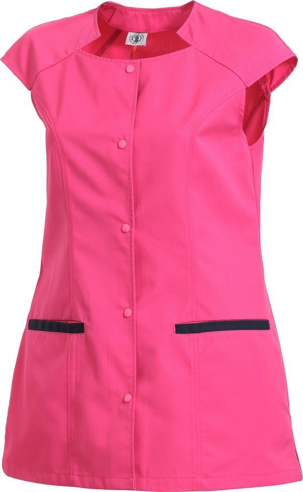 Tunique femme. Encolure fantaisie. Fermeture milieu devant par 5 pressions. Découpes princesse dos et devant. 2 poches basses passepoilées. Sans manches. Fentes côtés. Longueur : 75 cm.