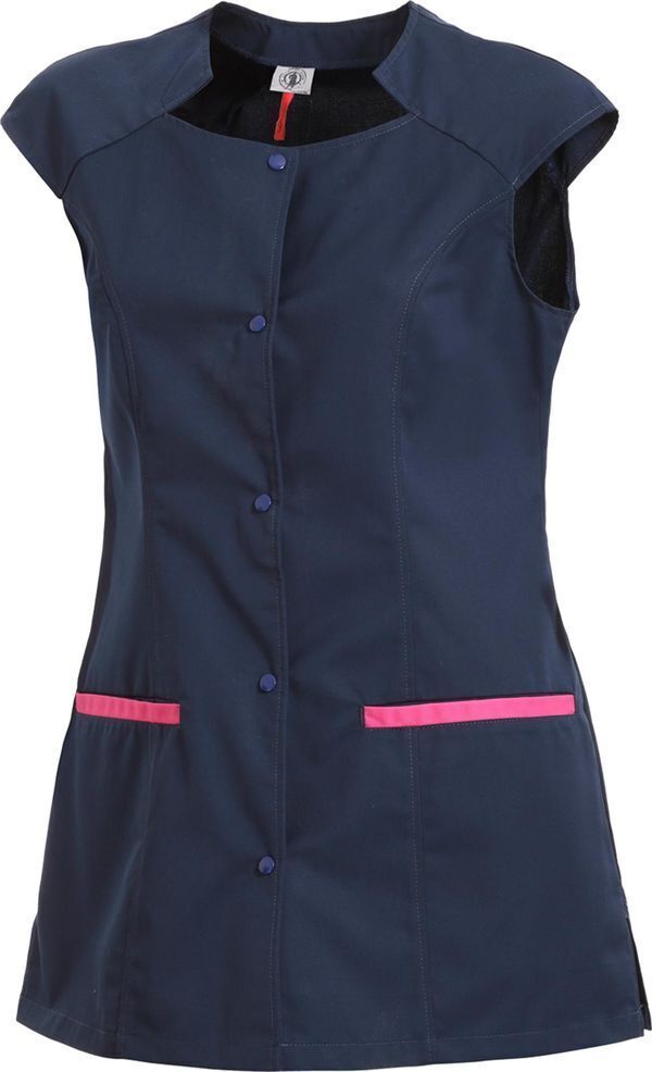 Tunique femme. Encolure fantaisie. Fermeture milieu devant par 5 pressions. Découpes princesse dos et devant. 2 poches basses passepoilées. Sans manches. Fentes côtés. Longueur : 75 cm.