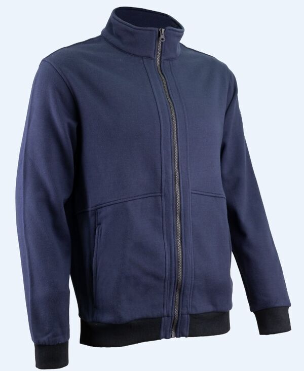 Gilet type sweat-shirt, col montant. Fermeture milieu devant par zip. 2 poches basses zippées sous passepoil. Ceinture et poignets en bord-côte.
