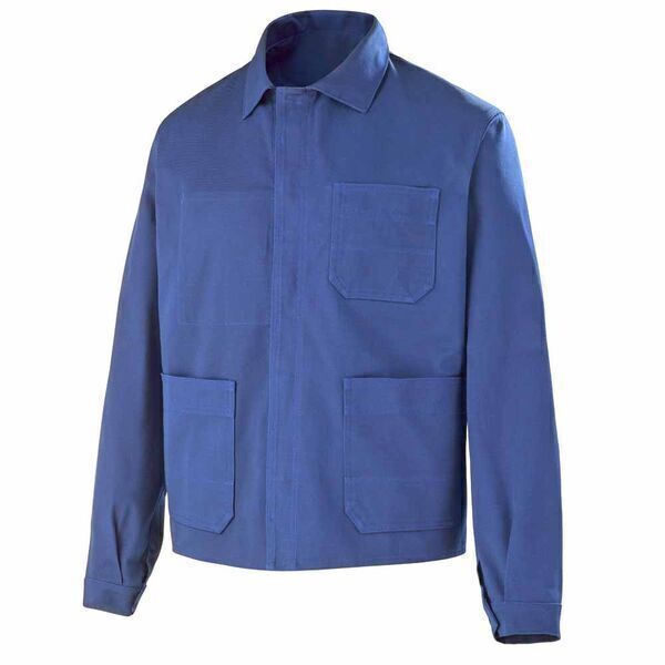 Veste, col cavalier. Fermeture milieu devant par boutons cachés sous-patte. Poche plaquée poitrine gauche avec renfort. 2 poches basses. Poche intérieure poitrine droite. Manches longues avec poignets fermés par bouton.