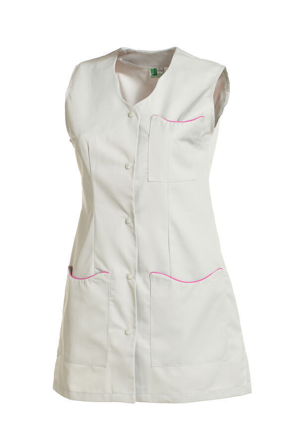 Tunique femme. Encolure fantaisie ton sur ton. Fermeture milieu devant par 5 pressions ton sur ton. 2 poches basses plaquées avec passepoil contrasté. Sans manches. Coupe cintrée. Longueur : 80 cm.