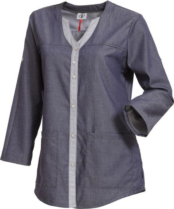 Tunique coupe femme. Encolure V. Fermeture devant par 6 pressions nacre. Pinces dos. Manches transformables. Empiècement devant et carrure dos. 1 poche poitrine invisible. 2 poches basses. Bas forme liquette. Fentes côtés. Longueur : 76 cm (selon la taille).