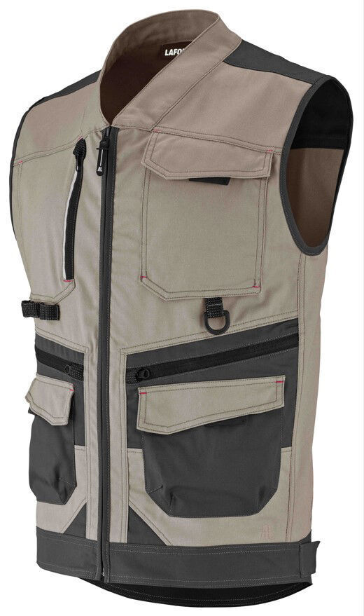 Gilet multipoches, col en V. 2 poches poitrine : droite fermé par zip verticale, détail rétroréfléchissant; gauche plaquée sous rabat fermé par pressions cachées. 2 double poches basses superposées. Empiècement dos contrasté. Découpes côtés. Ceinture droite avec patte de serrage côté fermé par pressions. Dos rallongé.