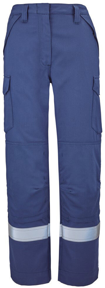 Pantalon femme poches genoux ATEX REFLECT. Ceinture élastiquée côtés avec réhausse dos, 5 passants. Fermeture centrale par bouton caché et braguette zippée. 2 poches italiennes à rabat fermé par boutons-pression cachés. 2 poches à rabat plaquées et soufflet à l'arrière fermé par boutons-pression cachés. Poches genoux. 1 poche à rabat dos fermé par boutons-pression cachés. Finition bas de jambes par ourlets. | Bandes rétroréfléchissantes de 50 mm. E.J. : 75 cm (+5 cm).