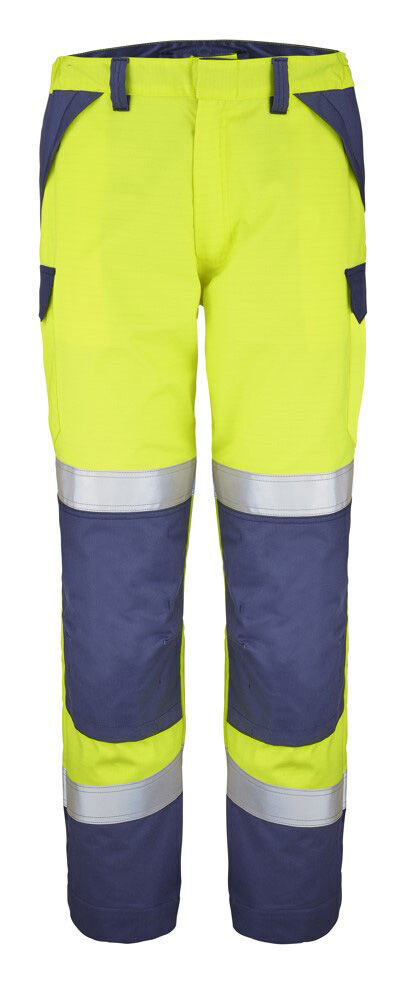 Pantalon poches genoux ATEX HV bicolore haute visibilité. Ceinture élastiquée côtés avec réhausse dos, 5 passants. Fermeture centrale par bouton caché et braguette zippée. 2 poches italiennes à rabat fermé par boutons-pression cachés. 2 poches à rabat plaquées et soufflet à l'arrière fermé par boutons-pression cachés. Poches genoux. 1 poche à rabat dos fermé par boutons-pression cachés. Finition bas de jambes par ourlets. | Bandes rétroréfléchissantes de 50 mm. E.J. : 80 cm (+5 cm).
