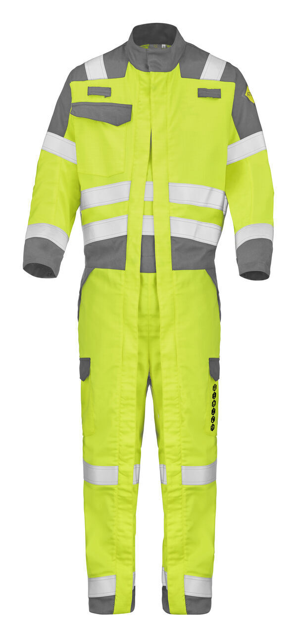 Combinaison, col montant. Fermeture centrale par 2 zip sous rabat fermée par boutons-pression cachés. 2 passants porte-dosimètre. Poche poitrine à rabat fermée par boutons-pression cachés. Ceinture élastiquée à la taille. 2 poches italiennes à rabat fermées par boutons-pression cachés. 2 poches cuisses à rabat fermées par boutons-pression cachés. Poche dos à rabat fermée par boutons-pression cachés. Manches longues, bas de manches fermés par boutons-pression intérieur. Transfert FR pictos. Mercerie amagnétique. Bandes rétroréfléchissantes de 50 mm.