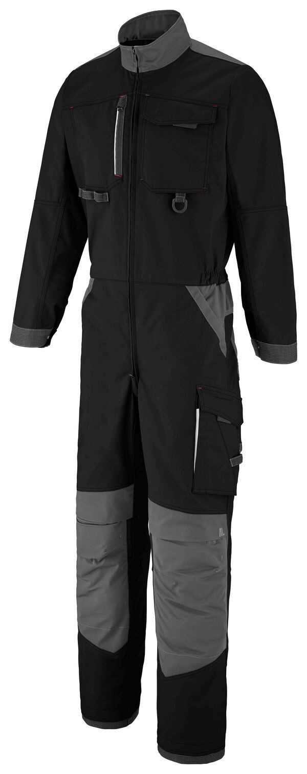 Combinaison, col montant avec protège-menton. Fermeture milieu devant par 2 zips. 2 poches poitrine : droite zippée avec bande rétroréfléchissante, gauche plaquée sous rabat fermé par 2 pressions cachées. Taille élastiquée côtés. 2 poches italiennes. Panneau d'aisance à l'entrejambe. Double poche cuisse gauche plaquée, fermée par rabat à pressions cachées, poche par ouverture verticale zippée. Empiècement dos. 2 poches revolver plaquées au dos avec bas volants, fermées par Velcro®. Poche mètre avec surpoche plaquée à double compartiment et bas volant. Manches longues avec poignets ajustables par pression. | E.J. : 82 cm (+5 cm).