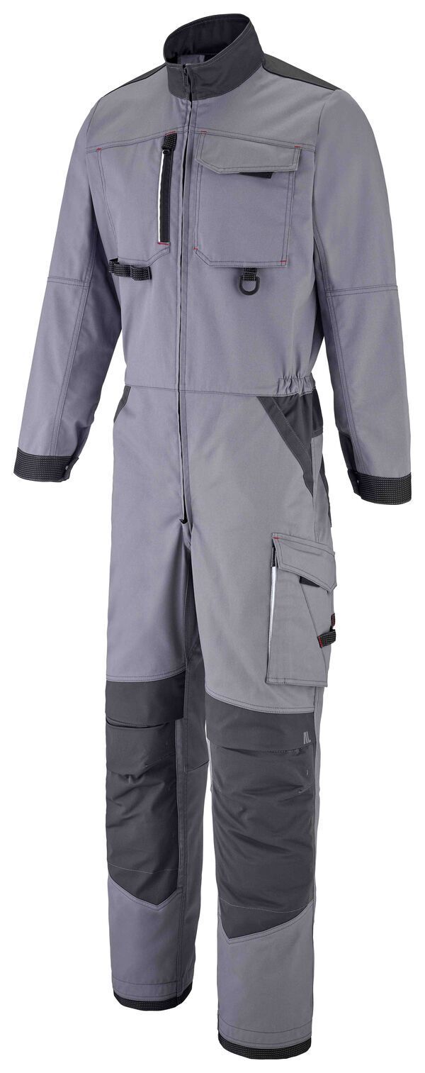 Combinaison, col montant avec protège-menton. Fermeture milieu devant par 2 zips. 2 poches poitrine : droite zippée avec bande rétroréfléchissante, gauche plaquée sous rabat fermé par 2 pressions cachées. Taille élastiquée côtés. 2 poches italiennes. Panneau d'aisance à l'entrejambe. Double poche cuisse gauche plaquée, fermée par rabat à pressions cachées, poche par ouverture verticale zippée. Empiècement dos. 2 poches revolver plaquées au dos avec bas volants, fermées par Velcro®. Poche mètre avec surpoche plaquée à double compartiment et bas volant. Manches longues avec poignets ajustables par pression. | E.J. : 82 cm (+5 cm).