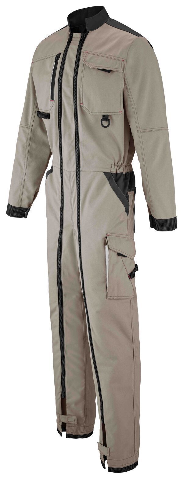 Combinaison double zip. Col montant. Fermeture milieu devant par 2 zips. 2 poches poitrine : droite zippée avec bande rétroréfléchissante, gauche plaquée sous rabat fermé par 2 pressions cachées. Taille élastiquée côtés. 2 poches italiennes. Panneau d'aisance à l'entrejambe. Double poche cuisse gauche plaquée, fermée par rabat à pressions cachées, poche par ouverture verticale zippée. Empiècement dos. 2 poches revolver plaquées au dos avec bas volants, fermées par Velcro®. Poche mètre avec surpoche plaquée à double compartiment et bas volant. Manches longues avec poignets ajustables par pression. | E.J. : 82 cm (+5 cm).