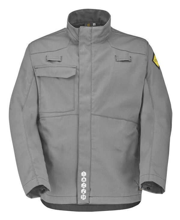 Blouson ATEX XP. Col montant. Fermeture milieu devant zippée sous-patte fermé par pressions cachées. 2 passants porte-dosimètre. 1 poche poitrine droite sous rabat fermé par pression cachée. 2 poches basses insérées dans découpes côtés, fermées par zip. Collerette de marquage intérieur dos. Bas de dos rallongé. Manches longues avec bas de manche fermé par pression intérieure.