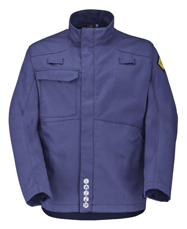 Blouson col droit. Fermeture centrale par boutons-pression sous rabat. 2 passants porte dosimètre. 1 poche poitrine et 2 poches basses à double entrée avec rabats fermés. Poche poitrine intérieure. Dos avec soufflet d'aisance et rallonge. Poignets à soufflets fermés par boutons-pression. Marquage sur ceinture gauche et manche droite. Mercerie plastique.