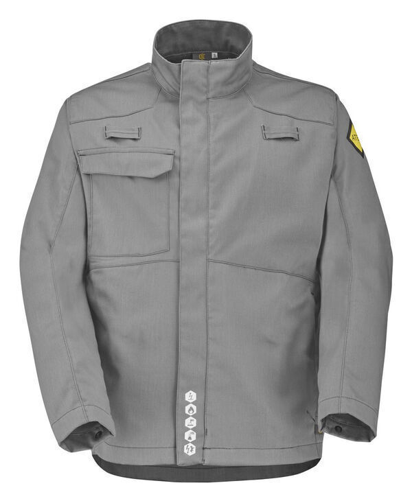 Blouson col droit. Fermeture centrale par boutons-pression sous rabat. 2 passants porte dosimètre. 1 poche poitrine et 2 poches basses à double entrée avec rabats fermés. Poche poitrine intérieure. Dos avec soufflet d'aisance et rallonge. Poignets à soufflets fermés par boutons-pression. Marquage sur ceinture gauche et manche droite. Mercerie plastique.