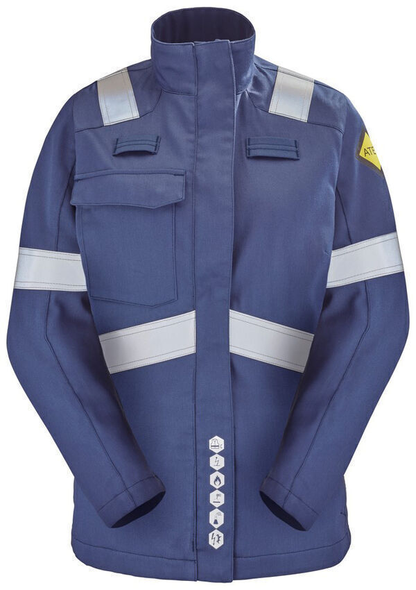 Blouson femme ATEX REFLECT. Col montant. Fermeture milieu devant zippée sous-patte fermé par pressions cachées. 2 passants porte-dosimètre. 1 poche poitrine droite sous rabat fermé par pression cachée. 2 poches basses insérées dans découpes côtés, fermées par zip. Collerette de marquage intérieur dos. Bas de dos rallongé. Manches longues avec bas de manche fermé par pression intérieure. Bandes rétroréfléchissantes de 50mm.