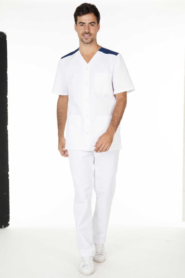 Tunique homme. Col V. Fermeture milieu devant par 5 grippers apparents sur patte. Fentes côtés. 2 poches basses, poche poitrine. Empiècements épaules contrastés. Manches courtes montées. Fentes côtés. Longueur : 80 cm.