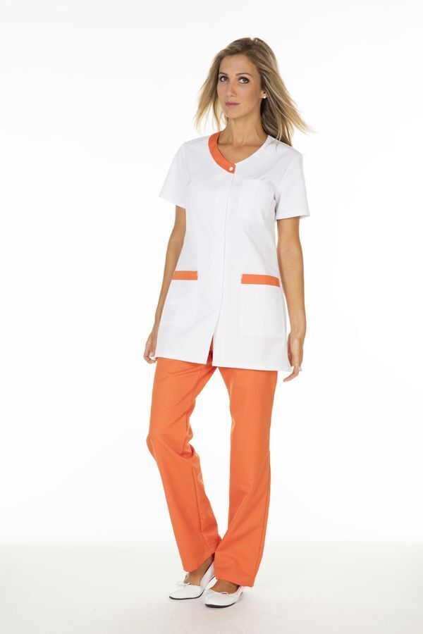 Tunique femme. Col V avec parement contrasté sur le côté droit. Fermeture milieu devant par 5 pressions calottées blanches. Pinces poitrine. 2 poches basses avec parement contrasté. Poche poitrine. Manches courtes montées. Fentes côtés. Longueur : 80 cm.