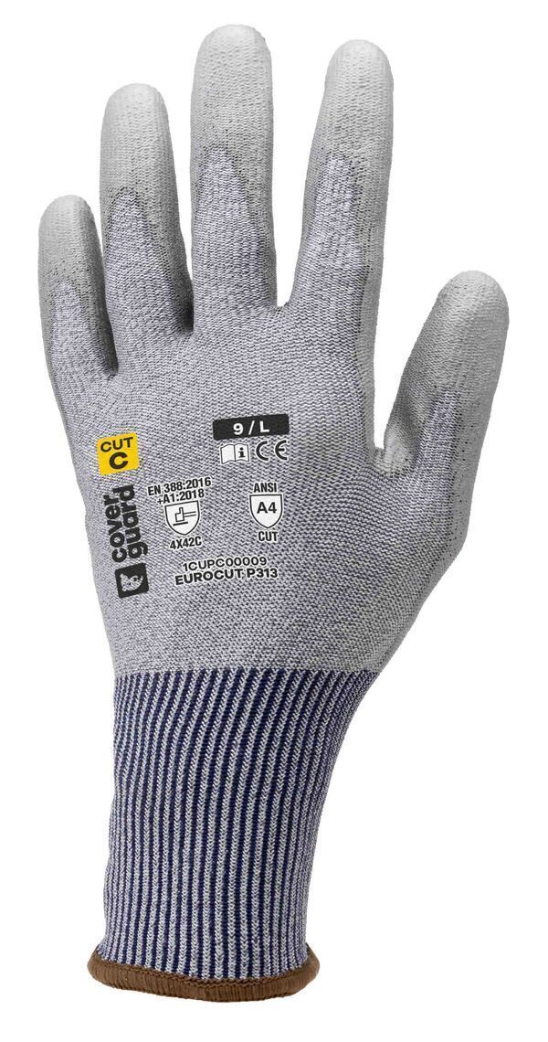 Gants support tricoté sans couture HDPE, polyamide et élasthanne. Jauge 13. Enduction PU. Poignet tricot élastiqué. Coupure : niveau C.