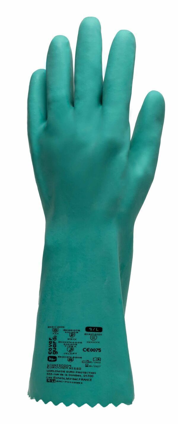 Gants nitrile sur support tricoté sans couture en polyester/coton. Finition lisse sur la paume. Manchette longue coupe feston. | Longueur : 35 cm. Épaisseur : 0,85 mm.