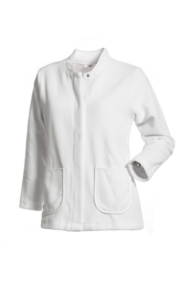 Passe-couloir polaire femme. Col montant. Fermeture milieu devant par 5 boutons-pression calottées ton sur ton. 2 poches basses. Manches longues montées. Longueur : 78 cm.
