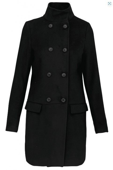 Manteau femme. Col montant, fermeture croisée 2x4 boutons. Découpe princesse. 2 poches basses avec rabat, 1 poche intérieure passepoilée. Entièrement doublé.