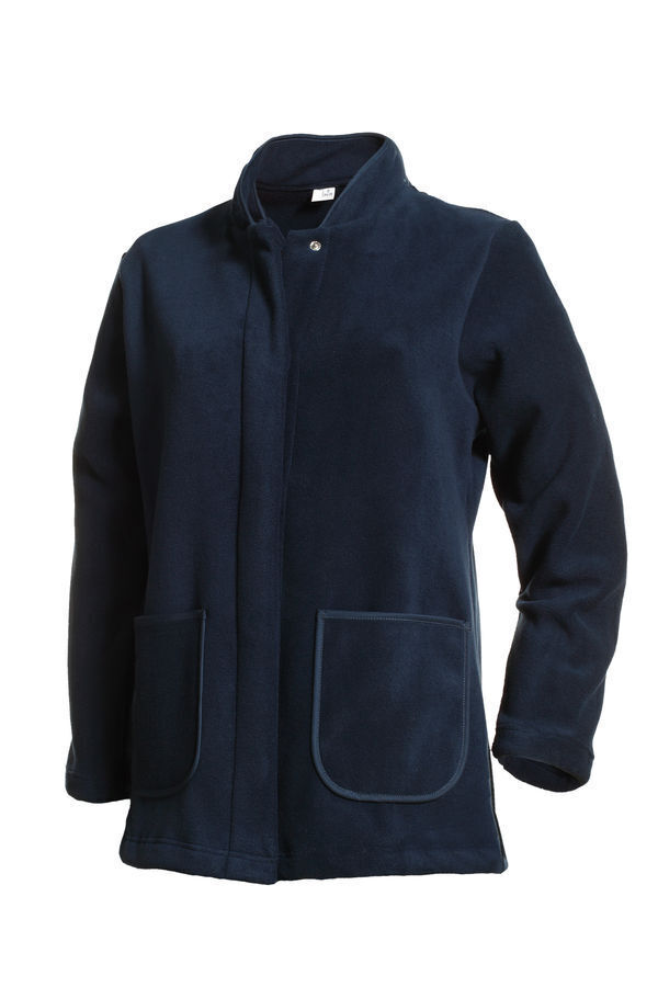 Passe-couloir polaire femme. Col montant. Fermeture milieu devant par 5 boutons-pression calottées ton sur ton. 2 poches basses. Manches longues montées. Longueur : 78 cm.