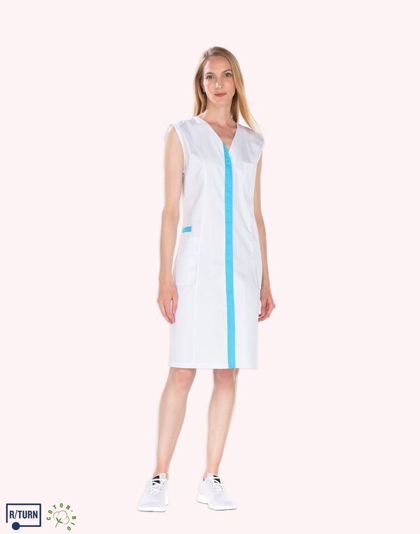 Tunique encolure V. Fermeture milieu devant par boutons-pression, parement contrasté. Découpe de cintrage. Poche poitrine, poche BIP. 2 poches basses semi-volantes. 2 fentes dos. Longueur : 75 cm.
