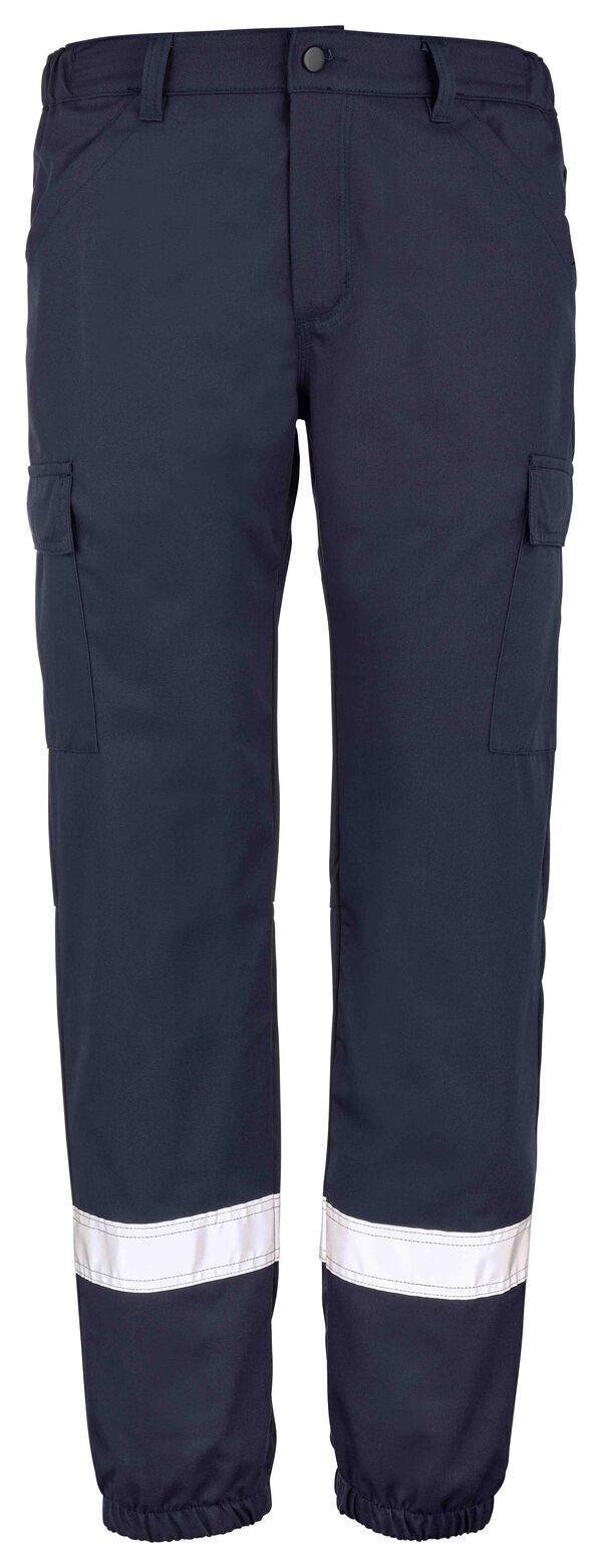 Pantalon femme . Ceinture côtés élastiqués, fermé par 1 bouton, braguette zippée. 2 poches italiennes, 2 poches à soufflet cuisses avec rabat et fermeture par Velcro®. 2 poches revolver plaquées aux dos. Panneaux d'aisance à l'entrejambe, 2 pinces jambes dos. Bas de jambes élastiqués. | Bandes rétroréfléchissantes 50 mm. E.J. femme : 78 cm.