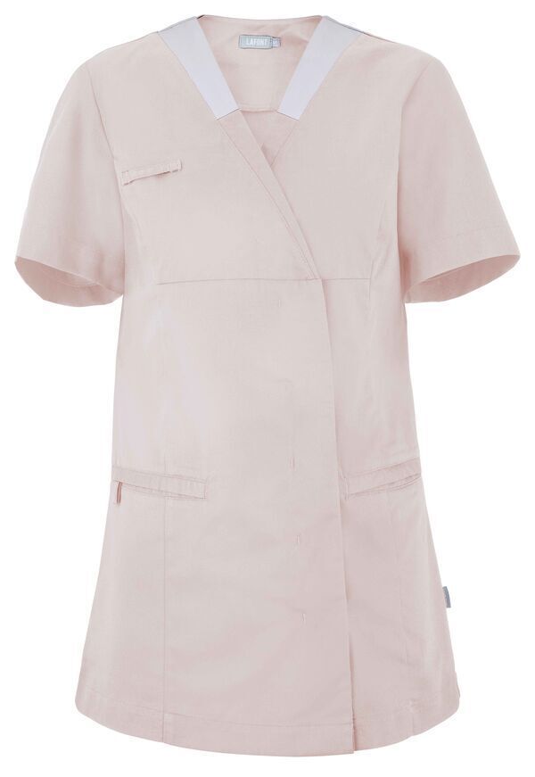 Tunique . Encolure V contrastée, collerette de marquage intérieur. Fermeture croisée par grippers cachés. Découpes princesses. Poche poitrine passepoilée. 2 poches basses passepoilées. Passant porte-badge. Manches courtes. Longueur : 75 cm.