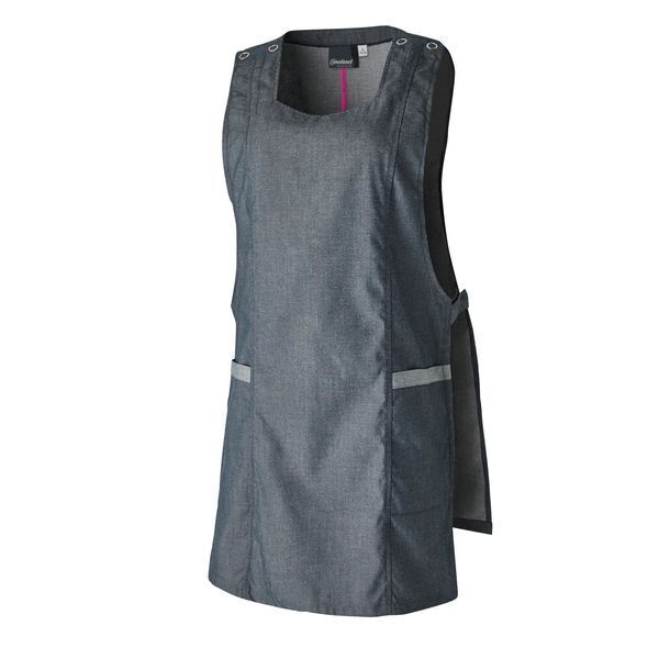 Chasuble coupe femme. Encolure fantaisie. 2 pressions décoratives aux épaules de chaque côté. Découpes bretelles devant et dos. Fermetures côtés par pattes ajustables par grippers 2 positions. 2 poches basses avec parements denim inversé. Longueur : 80 cm.