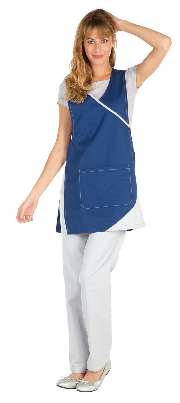 Chasuble femme. Encolure effet cache-coeur, finition biais sur le devant droit. Empiècement contrasté bas gauche. Fermeture côtés par pattes à pressions. Poche ventrale avec poche téléphone et poche stylo. Longueur : 80 cm.