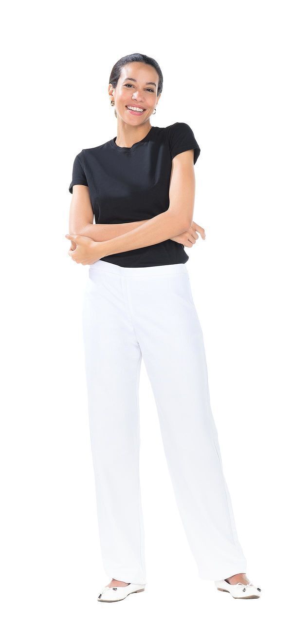 Pantalon femme. Ceinture élastique dos, réglable par boutonnière, zip invisible au côté. Coupe droite. E.J. : 82 cm.