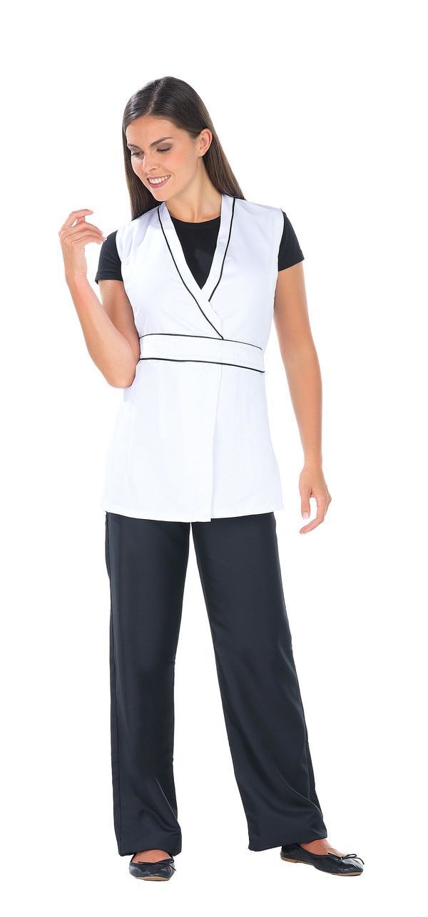 Tunique sans manches à fermeture croisée cache-cœur, ceinture et lien. Passepoil contrasté à l'encolure et ceinture. Sans poche. Fentes manches et côtés. Longueur : 75 cm.