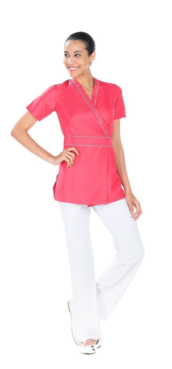 Tunique à fermeture croisée cache-cœur, ceinture et lien. Passepoil contrasté à l'encolure et ceinture. Sans poche. Manches courtes. Fentes manches et côtés. Longueur : 75 cm.