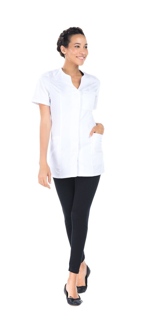Tunique encolure V. Fermeture milieu devant par boutons-pression. Manches courtes. 3 poches, 1 poche bip dans la poche poitrine. Coupe ajustée. Longueur : 75 cm.