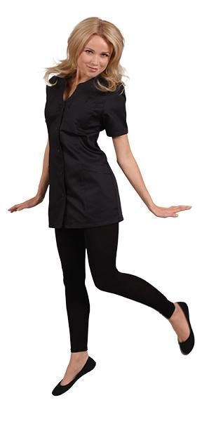 Tunique encolure V. Fermeture milieu devant par boutons-pression. Manches courtes. 3 poches, 1 poche bip dans la poche poitrine. Coupe ajustée. Longueur : 75 cm.