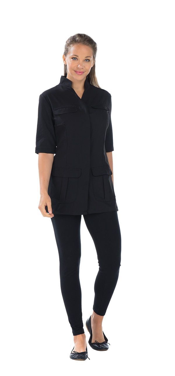 Tunique à col officier. Fermeture asymétrique par boutons-pression sous patte. Manches courtes. 2 poches basses. 2 poches BIP. Poche stylo sur manche gauche. Soufflet d’aisance dos. Maille dos et cotés. Fentes côtés. Longueur : 75 cm.