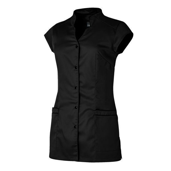 Tunique encolure fantaisie et parementure bordée d’un passepoil contrasté (sauf col noir). Fermeture par pressions apparentes milieu devant. Pinces devant, dos et poitrine. 2 poches basses avec passepoils contrastés. Petites manches. Fentes côtés. Longueur : 75 cm.