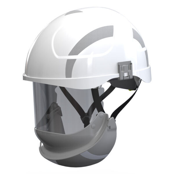 Casque avec écran intégré pour électricien et protection Arc-Flash. Coiffe textile. Calotte en ABS avec bandes rétroréfléchissantes. Système de serrage crémaillère. Protège face menton et cou, modulaire et rétractable. Jugulaire 4 points. Écran faciale Classe optique 2.