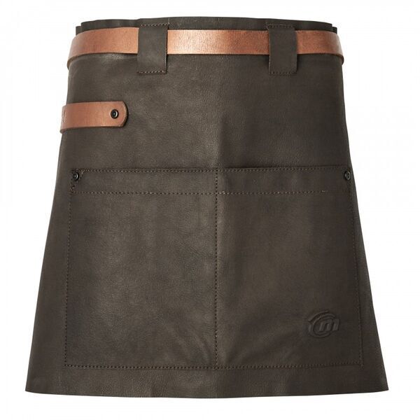 Tablier cuir avec ceinture réglable. Possibilité d’insérer la boucle de ceinture dans le passant. Accroche torchon, grande double poche, rivets de renfort. Longueur : 40 cm