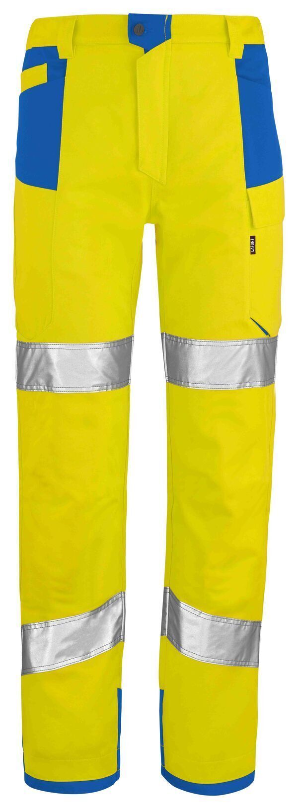 Pantalon haute visibilité. Ceinture élastiquée côtés avec 5 passants. Fermeture à glissière et bouton clou apparent. 2 poches cavalières contrastées. Poche ticket côté droit. Poche cuisses à soufflet sous rabat fermé par bouton caché. Poche mètre à soufflet. Poche dos plaquée. | Bandes rétroréfléchissantes segmentées 70 mm. E.J. : 80 cm (+5 cm). Existe en Ripstop été : 1HVNL