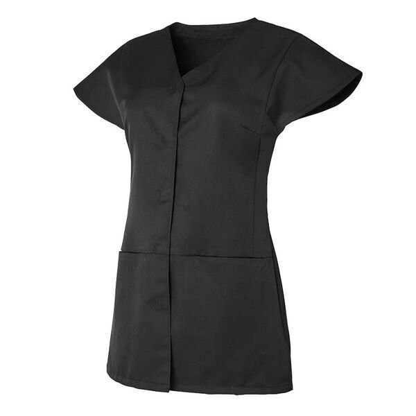 Tunique col V. Fermeture milieu devant par grippers cachés. Découpes princesse devant et dos. Empiècement taille avec poches basses invisibles. Manches courtes papillon. Fentes côtés. Longueur : 75 cm.