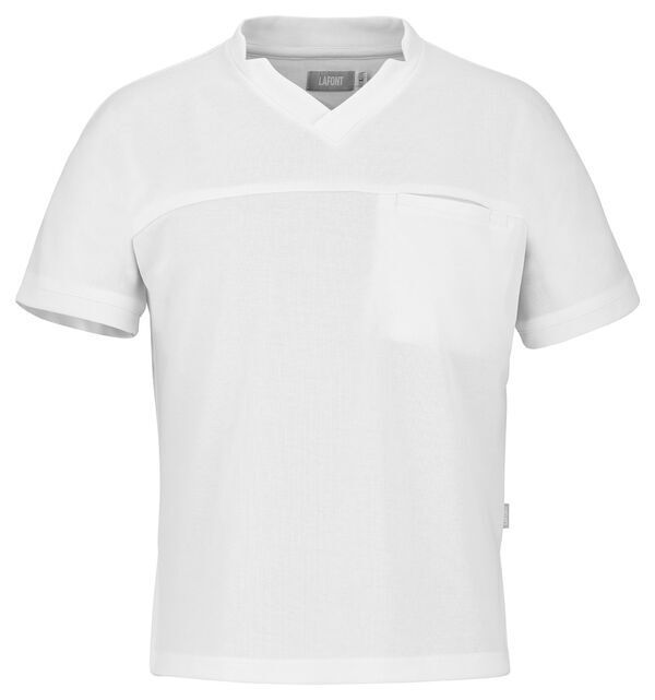 T-shirt mixte. Col biseauté. Poche poitrine passepoilée avec compartiment stylo. Manches finition rapportée. Dos rallongé. Fentes aux côtés.