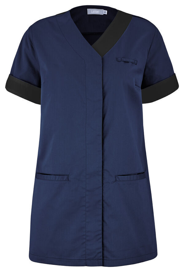 Blouse femme. Fermeture milieu devant par boutons-pression cachés. Passant porte-badge côté gauche, 2 poches passepoilées dont une à 3 compartiments et 1 passant pendoir côté. Œillets d'aération brodés sous les bras, manches courtes retroussables avec bas de manches revers contrastés. Longueur : 75 cm.
