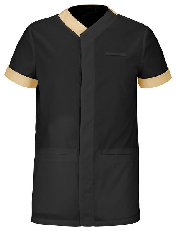 Tunique homme. Fermeture milieu devant par boutons-pression cachés, passant pour porte-badge côté gauche, 2 poches passepoilées dont une à 3 compartiments et 1 passant pendoir côté. Œillets d'aération brodés sous les bras. Manches courtes avec bas de manches revers intérieur contrasté. Longueur : 80 cm.