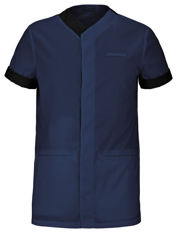 Tunique homme. Fermeture milieu devant par boutons-pression cachés, passant pour porte-badge côté gauche, 2 poches passepoilées dont une à 3 compartiments et 1 passant pendoir côté. Œillets d'aération brodés sous les bras. Manches courtes avec bas de manches revers intérieur contrasté. Longueur : 80 cm.