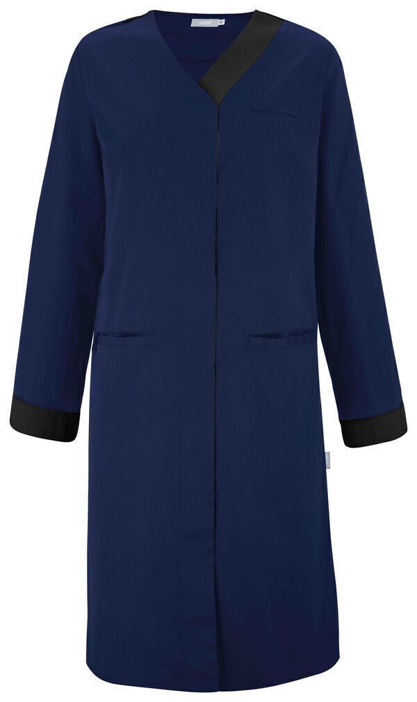 Blouse femme. Fermeture milieu devant par boutons-pression cachés. Passant porte-badge côté gauche, 2 poches passepoilées dont une à 3 compartiments et un passant pendoir côté. Oeillets d'aération brodés sous les bras, manches longues retroussables avec bas de manches revers contrastés. Longueur : 100 cm.